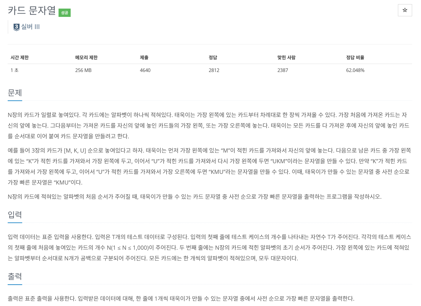 카드 문자열 문제는 가장 왼쪽에 있는 카드부터 차례대로 한 장씩 가져오며, 가져온 카드를 가져온 카드 가장 왼쪽 혹은 오른쪽에 놓으며 사전 순으로 가장 빠른 문자열을 만들어야 하는 문제입니다.