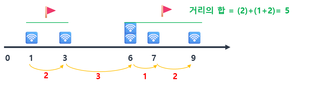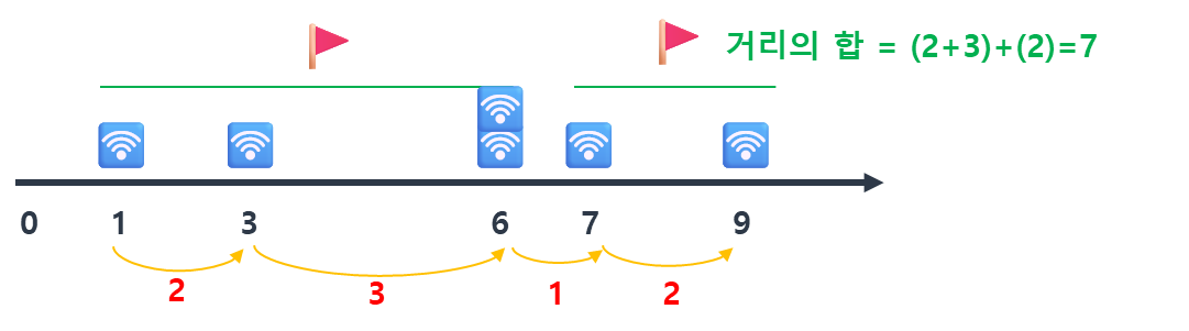 집중국의 수신 가능 영역의 거리의 합을 계산하는 과정을 첫 번째 예시로 그림으로 그려보면 다음과 같습니다.
