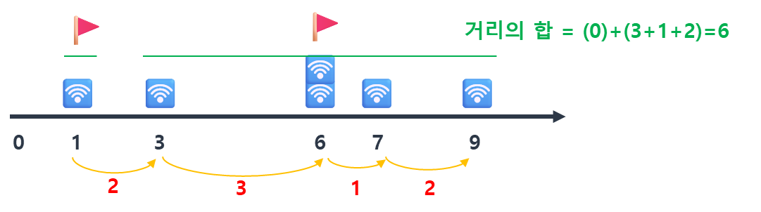 - 가장 긴 k-1개의 거리 제거: 집중국이 k개라면 센서를 k개의 구간으로 분리할 수 있습니다. 따라서, 센서 간 거리 중 가장 긴 k-1개의 구간을 제거하면 집중국 간의 수신 거리를 최소화할 수 있습니다.