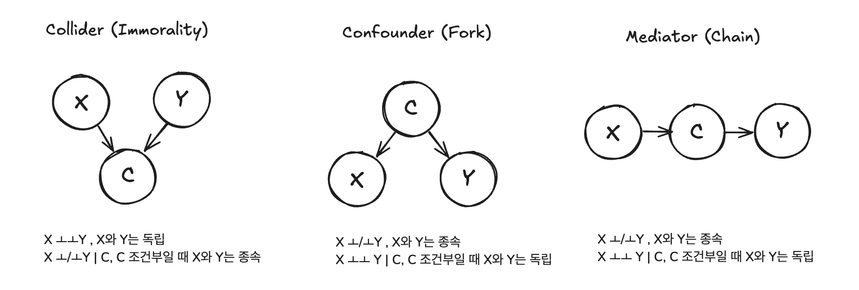- 예를 들어, X-Z-Y 구조에서 X와 Y는 종속(X⊥/⊥Y)이고 Z를 조건부로 했을 때 X와 Y가 독립(X⊥Y|Z) 일 때 그릴 수 있는 그래프는 3가지입니다.