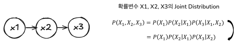각 변수는 부모 변수가 주어졌을 때 나머지 조상 변수들과는 독립적이라고 가정합니다. 즉, 특정노드는 직접적으로 영향을 주는 부모 노드에만 종속되고 나머지 조상 노드들과는 독립입니다. 예를 들어, 아래 그림을 보면 X3는 X2에만 직접적인 영향을 받고, X1으로부터는 간접적인 영향을 받고 있기 때문에 X1과 X3은 독립이라고 판단할 수 있습니다. 그렇기에 P(X3|X1, X2)가 P(X3|X2)로 변경하여 결합 확률 분포를 계산하면 됩니다.