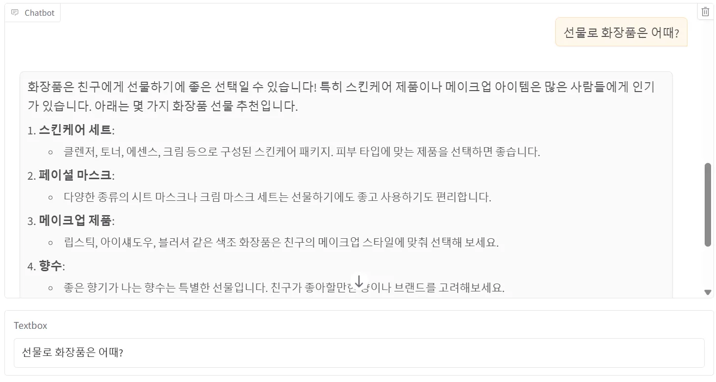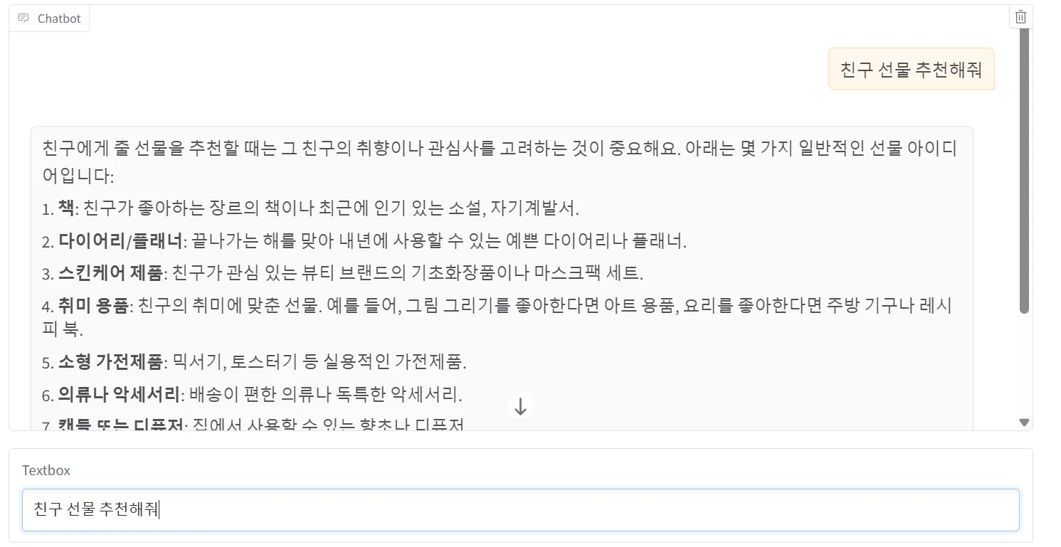 # 입력: chatbot(대화 히스토리), textbox(사용자 입력)