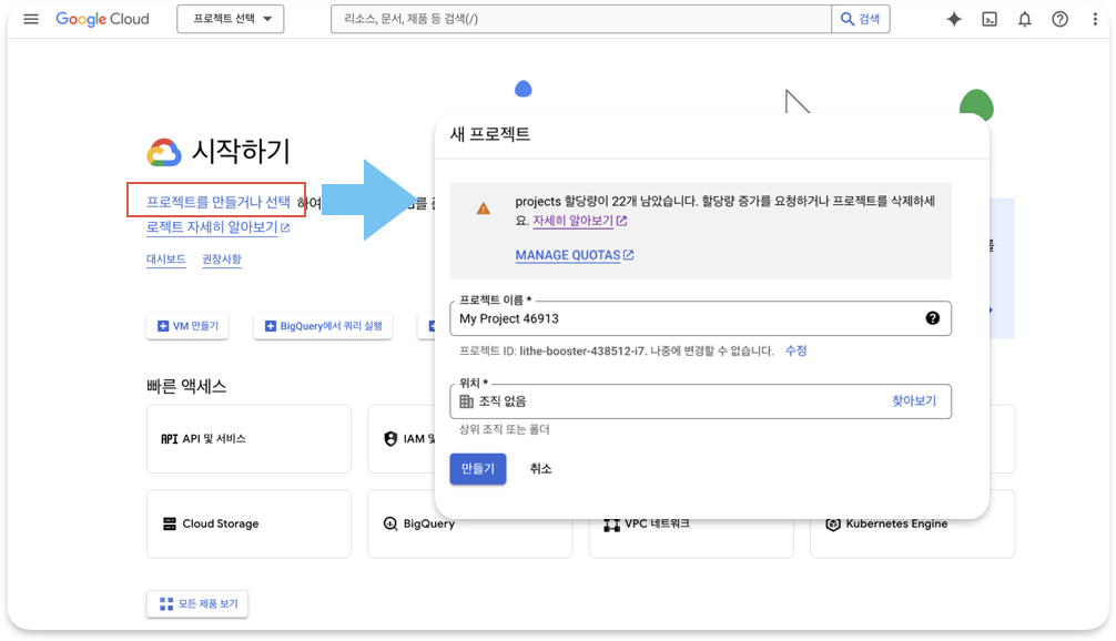 구글 클라우드 서비스는 프로젝트 단위로 금액이 청구되고 공동작업자 추가 및 삭제와 리소스 권한 관리가 이루어진다. 무료 계정이라도 여러 프로젝트를 만들 수 있기 때문에 여러 프로젝트를 진행 중이라면 프로젝트를 여러 개 만들어서 따로 관리가 가능하다. '프로젝트 만들거나 선택'을 누른 후, 프로젝트 명을 입력해 주면 된다. 만들기를 누르면 대시보드 화면이 나타난다.