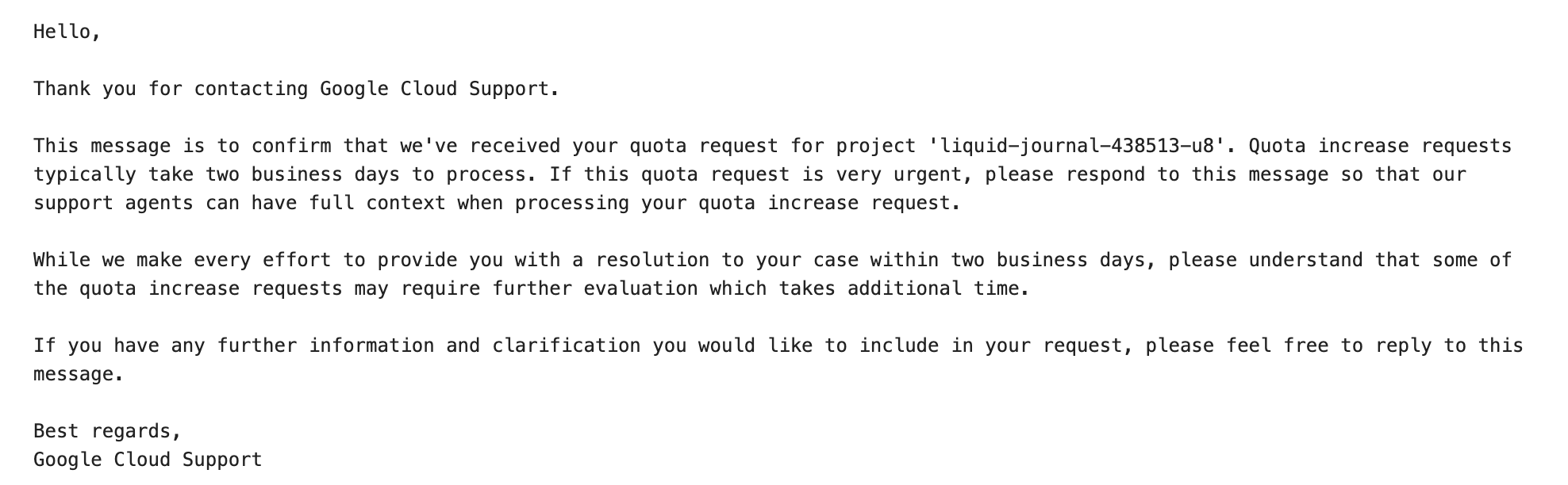 할당량 상향을 요청하면 메일로 2일 걸릴 것이다 라는 메일을 받는다. 하지만 1일에서 빠르다면 바로 요청이 승인되기도 한다. 상향 조정이 완료되면 완료되었다고도 메일로 안내되니 메일을 참고하면 좋을 것 같다.