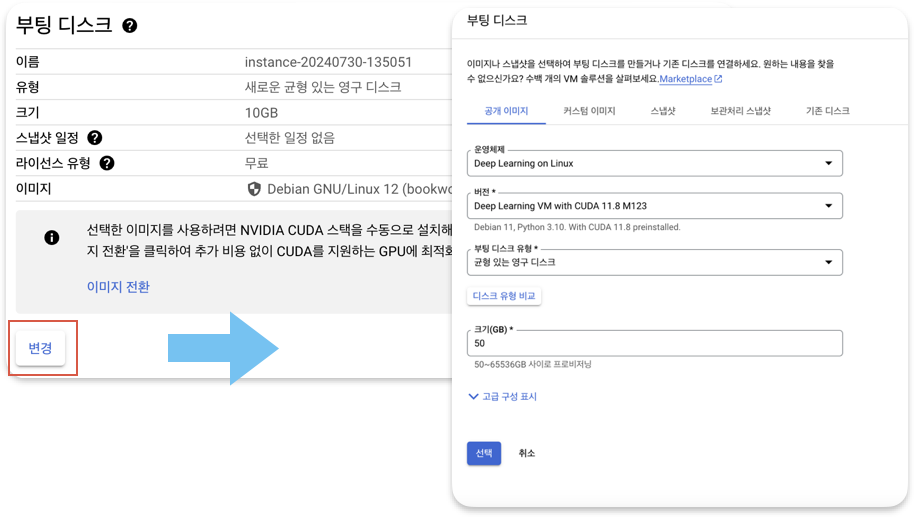 그리고 부팅디스크의 설정도 기존 10GB로 설정되었지만, 모델 학습하고 저장하기에는 부족한 용량이라 변경이 필요하다. 변경 버튼을 통해 부팅디스크 설정 페이지에서 크기를 50GB로 늘려주었다. 이 또한 최소한으로 잡은거라 필요에 따라 크기를 넉넉하게 잡아 사용할 필요가 있다. 그리고 부팅디스크 안내메시지에 나와 있는 것처럼 부팅디스크의 이미지를 기본 이미지가 아니라 CUDA가 설치되어 있는 딥러닝 이미지로 전환하면 손쉽게 CUDA 버전이 안 맞아서 골머리를 앓지 않아도 된다.