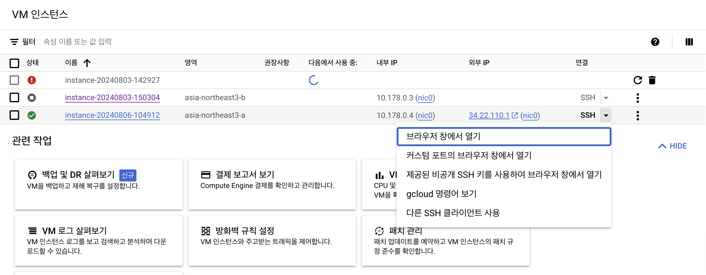왼쪽 상탄 탐색 메뉴에서 Compute Engine > VM 인스턴스를 누른다. 제품 설치 페이지가 나오고, 설치 버튼을 누르면1분 정도 후에 VM 인스턴스 화면이 나타나게 된다.