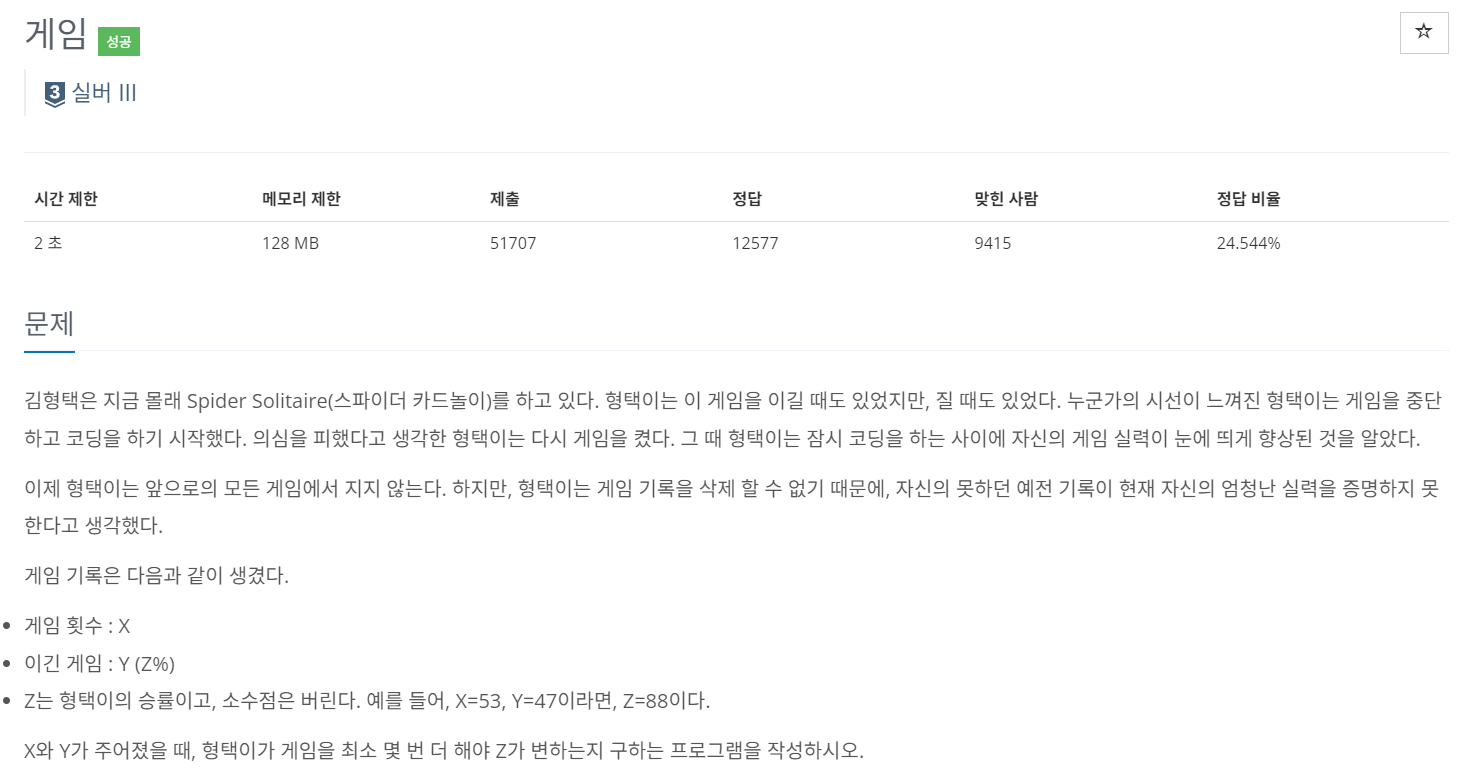 형택이가 게임을 몇 번 더 해야 승률이 변하는지를 찾는 것으로, 주어진 입력은 두 개의 정수 (총 게임 수)와 (이긴 게임 수)입니다. 승률 는 𝑌를 𝑋로 나눈 후 100을 곱하여 계산합니다. 이때 소수점은 버립니다.