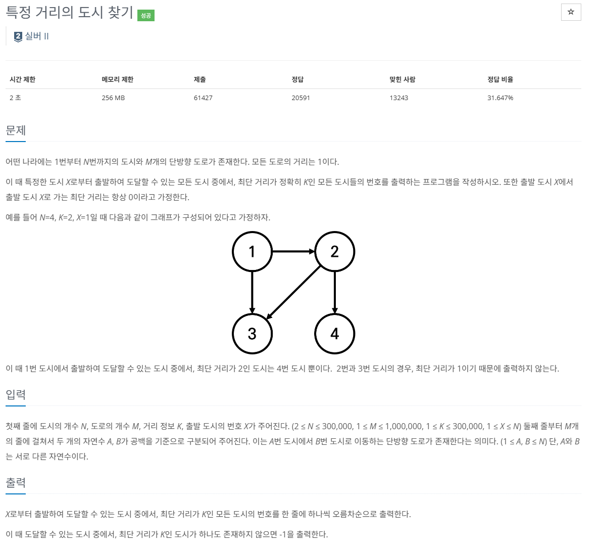 이 문제는 주어진 도시와 도로의 정보를 바탕으로, 특정 거리 K에 있는 도시를 찾는 문제입니다.