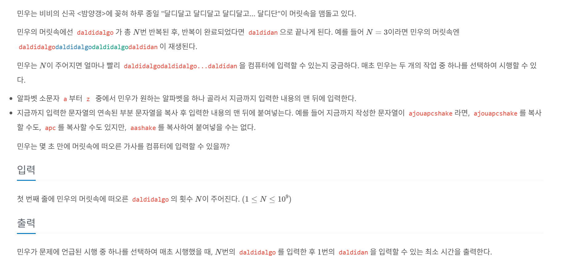 - N - (2**i) < 0이면, 반복 횟수 N에 도달하지 못했으므로, 현재까지 수행한 복사 연산에 하나씩 추가하는 연산을 통해 남은 패턴을 완성합니다. 이 경우 count에 i + 1을 더해 최종 시간을 구하고 종료합니다.