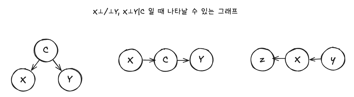 - 예를 들어, X-Z-Y 구조에서 X와 Y는 종속(X⊥/⊥Y)이고 Z를 조건부로 했을 때 X와 Y가 독립(X⊥Y|Z) 일 때 그릴 수 있는 그래프는 3가지입니다.