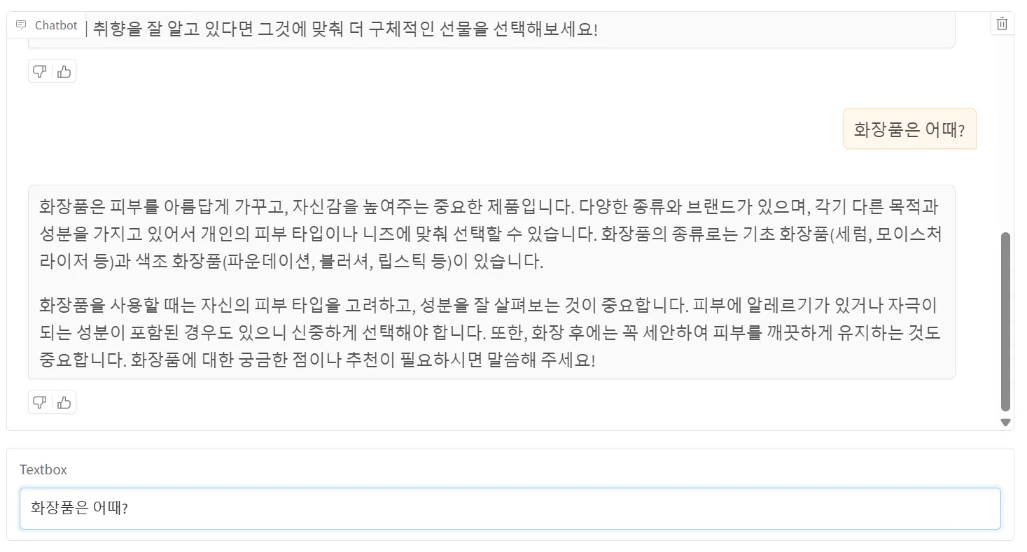 # 입력: chatbot(대화 히스토리), textbox(사용자 입력)