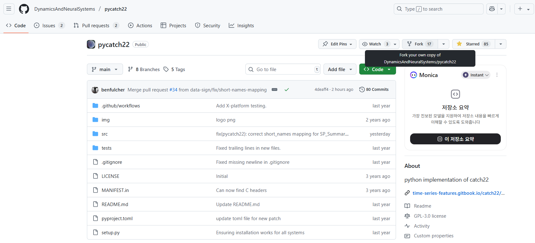 2. 우측 상단 ‘Fork’ 버튼 클릭 → 내 계정(your-username/catch22)으로 복사