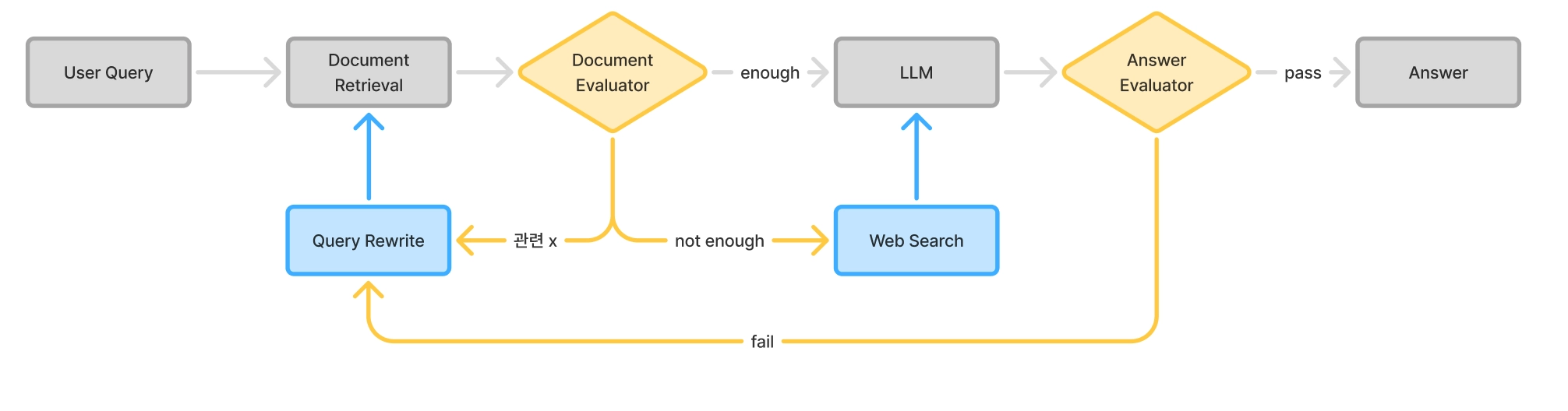 문서를 검색한 후, 검색된 문서에 대해서 관련있는지 평가하여 쿼리를 재작성하거나 웹서치를 통해 관련 있는 맥락을 추가할 수 있습니다. 최종 답변에 대해서도 평가를 거쳐 문제가 있으면 다시 쿼리를 다시 작성하도록 하여 답변 퀄리티를 보장할 수 있게 파이프라인을 구축할 수 있습니다.